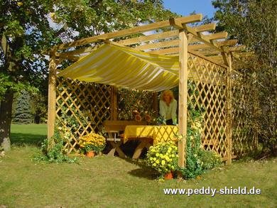 Dubbele pergola solitair met vlakdekkende bescherming tegen de zon en regenDeze grote dubbele pergola (maten: aan de binnenkant 360 x 280 cm) kan aan de binnenkant helemaal met draden worden bespannen: