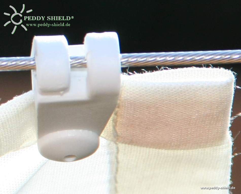 Runners waarmee u het zonnezeil eenvoudig aan de staaldraad bevestigt en zijwaarts kunt verschuiven.