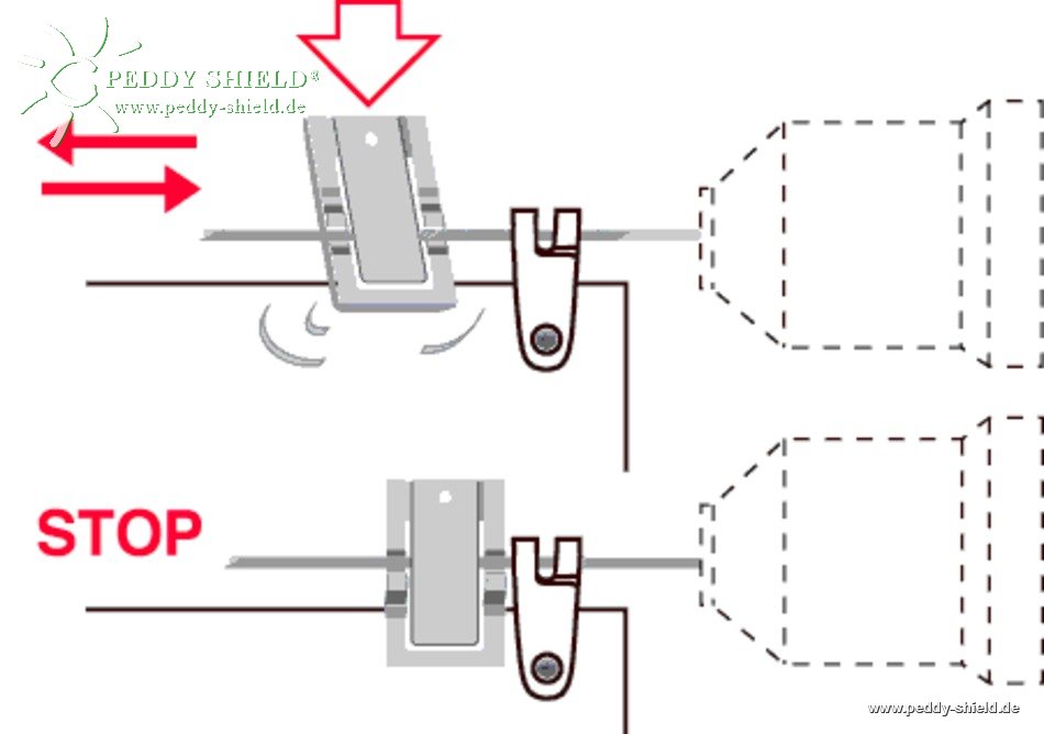 Verhindert het zijwaarts schuiven van het zonnezeil bij lichte wind, zonder bij hevige wind het sluiten te blokkeren. Ook ter verhindering van het naar beneden schuiven van zonnezeilen bij een schuine spandraadgeleiding (serres e.d.).