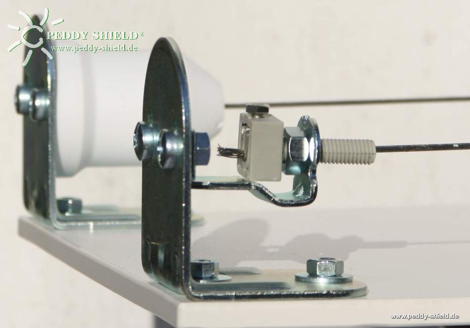Op de schroefdraad (M8) van de spanschroef komt een moer op de spanhaak, zodat door te draaien aan de moer met een kleine montagesleutel het gefixeerde draadeinde naar buiten beweegt. Hierdoor wordt de draad gespannen (uitsluitend Peddy-Shield heeft een dergelijk spansysteem met spanschroeven, die zo eenvoudig te bedienen zijn ca. 3 cm spanbereik hebben). Bij een ondergrond die door de draadspanning iets meeveert (bv. een houtconstructie), is een groter spanbereik met 2 x 3 cm zeer gunstig en bij ons ingepland.