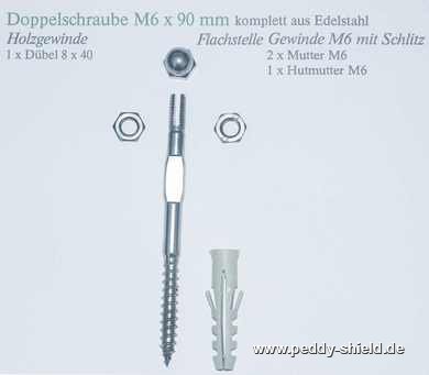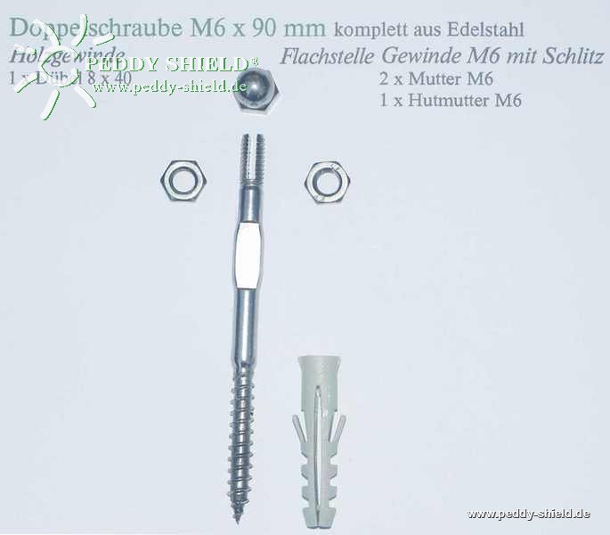 De dubbelschroef M6 x 90 is aan de bovenzijde voorzien van een M6-schroefdraad (waar de moer opgeschroefd wordt). Aan het bovenste einde is de schroef voorzien van een gleuf, dit ter opname van de staaldraad. Bovendien is de schroef voorzien van een speciaal vlak waardoor deze makkelijk vast te grijpen is met een tang en verlicht zo het indraaien in de ondergrond.