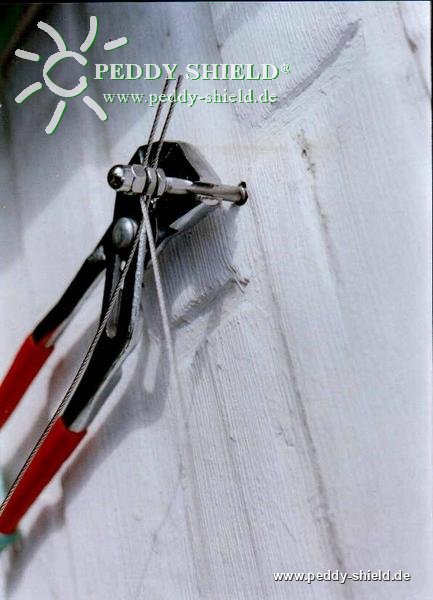 - 1 dubbelschroef van RVS met een doorsnede van 6 mm. De dubbelschroef is 90 mm lang en is aan de bovenzijde gespleten. Dit ter opname van de staaldraad. Deze staaldraad wordt middels een moer vastgeklemd op de dubbelschroef. Bovendien is de schroef voorzien van een speciaal vlak waardoor deze makkelijk vast te grijpen is met een tang en verlicht zo het indraaien in de ondergrond.
