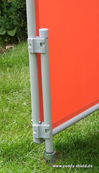 - de verbindingsclips houden het paneel en de staande buis stabieler indien de clip aan de kant van het paneel dusdanig op de onderste schroef steekt, dat deze niet kan draaien op het paneel (patent Peddy Shield)