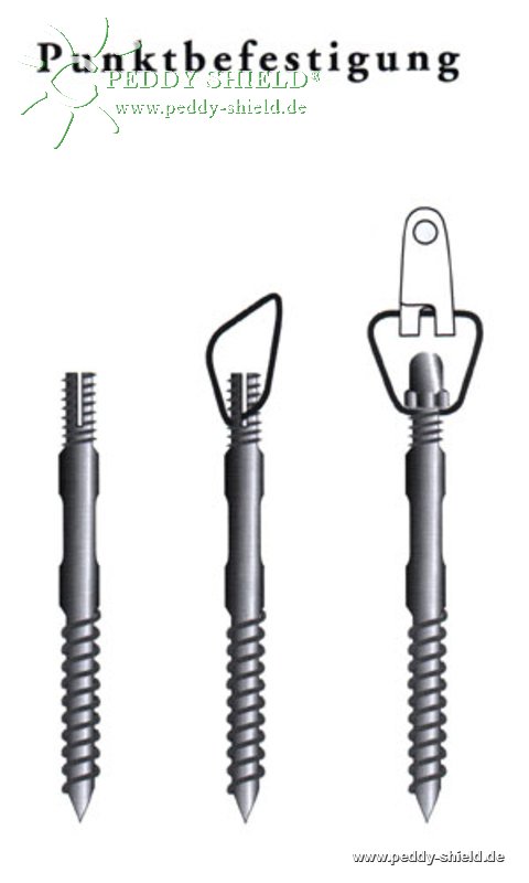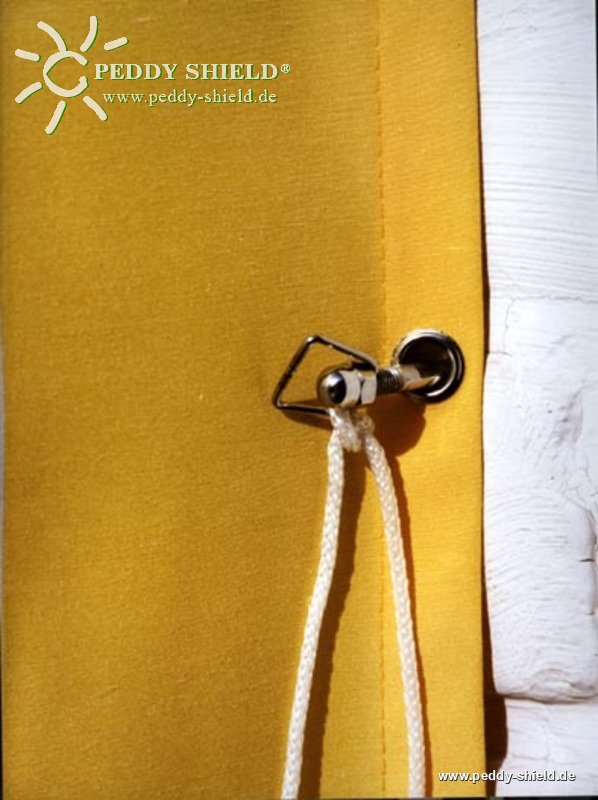Het wandzijdig positioneren van het zonnezeil type "verticaal" kan heel eenvoudig door een of beide metalen oogjes aan de dubbelschroef te bevestigen. De trapeziumring houdt niet alleen het zonnezeil is de gewenste positie, maar kan ook gebruikt worden voor het vastbinden van een koord, waarmee het zonnezeil type "verticaal" in de geparkeerde positie blijft.