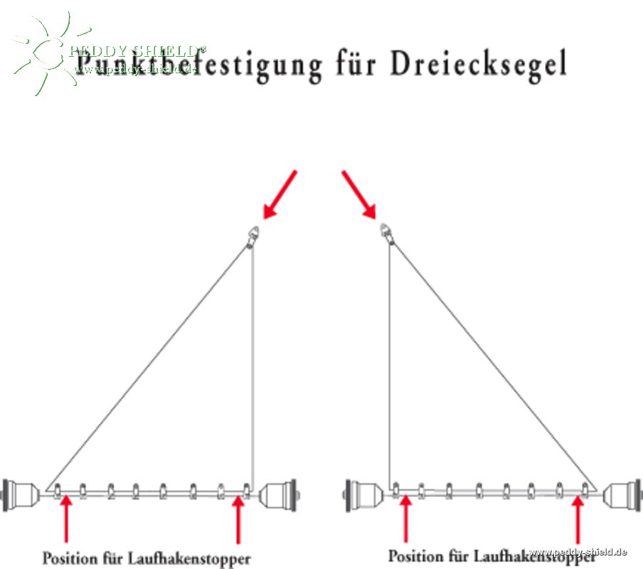 De basiszijde van een 3-punts zonnezeil kan aan een staaldraad worden opgehangen, welke men spant middels het afspansysteem. De punt bevestigt men dan aan de puntbevestiging.