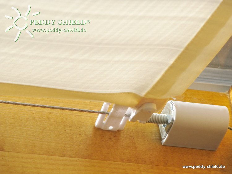 Indien u een serre of glasdak heeft met een schuinte groter dan 15°, raden wij u aan om achter een van de runners aan de onderzijde een stopper te klemmen. Dit om te voorkomen dat het zonnezeil ongewenst naar beneden schuift. De stopper heeft het ongekende voordeel dat deze alleen remt en niet blokkeert. De remkracht kunt u zelf m.b.v. waterdamp reguleren